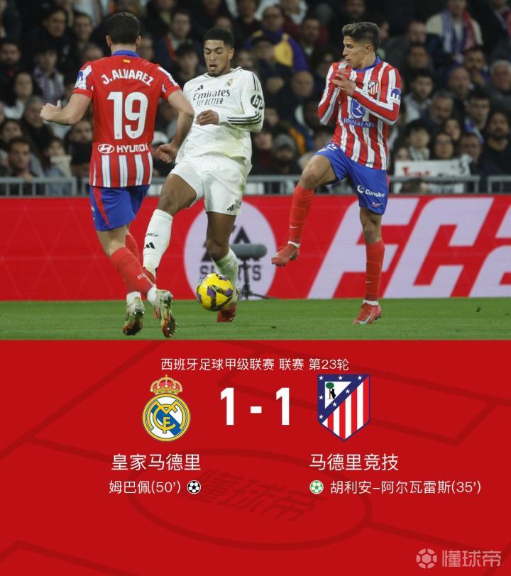 最终,全场比赛结束,皇家马德里1-1与马德里竞技握手言和。这场激烈的对决将双方实力展现得淋漓尽致,也为西甲积分榜的角逐增添了更多未知的悬念。下一轮比赛,双方将再次争夺胜利,争夺联赛积分榜的领先地位。皇马能否保持优势,还需更多时间的检验。