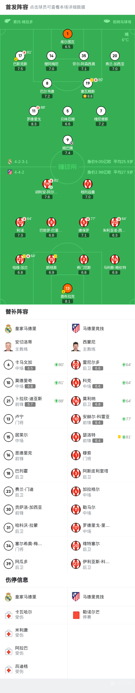 在西班牙足球甲级联赛第23轮的较量中,皇家马德里坐镇主场迎战马德里竞技。比赛开始前,双方球员摩拳擦掌,士气高涨,场面紧张。皇马全队齐心协力,不敢有丝毫松懈。马竞则展现出一贯的斗志,誓要给皇马制造不小阻力。